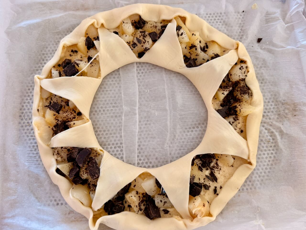 Découvrez la couronne des rois réalisée au KitchenAid. C’est plus léger que la version que je vous avais proposée l’an dernier (galette des rois clic) mais le principe est le même : de la crème d’amandes clic , des poires et du chocolat.